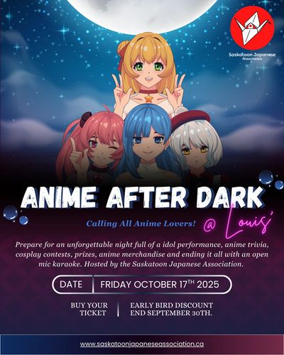 On October 17, 2025 starting at 8:30pm at Louis'; those 19+ can join us for a live idol performance, anime trivia, cosplay contest, open mic karaoke, and maybe purchase anime merch from our non-profit to help support our programming. Prizes are available for trivia and cosplay contest winners.